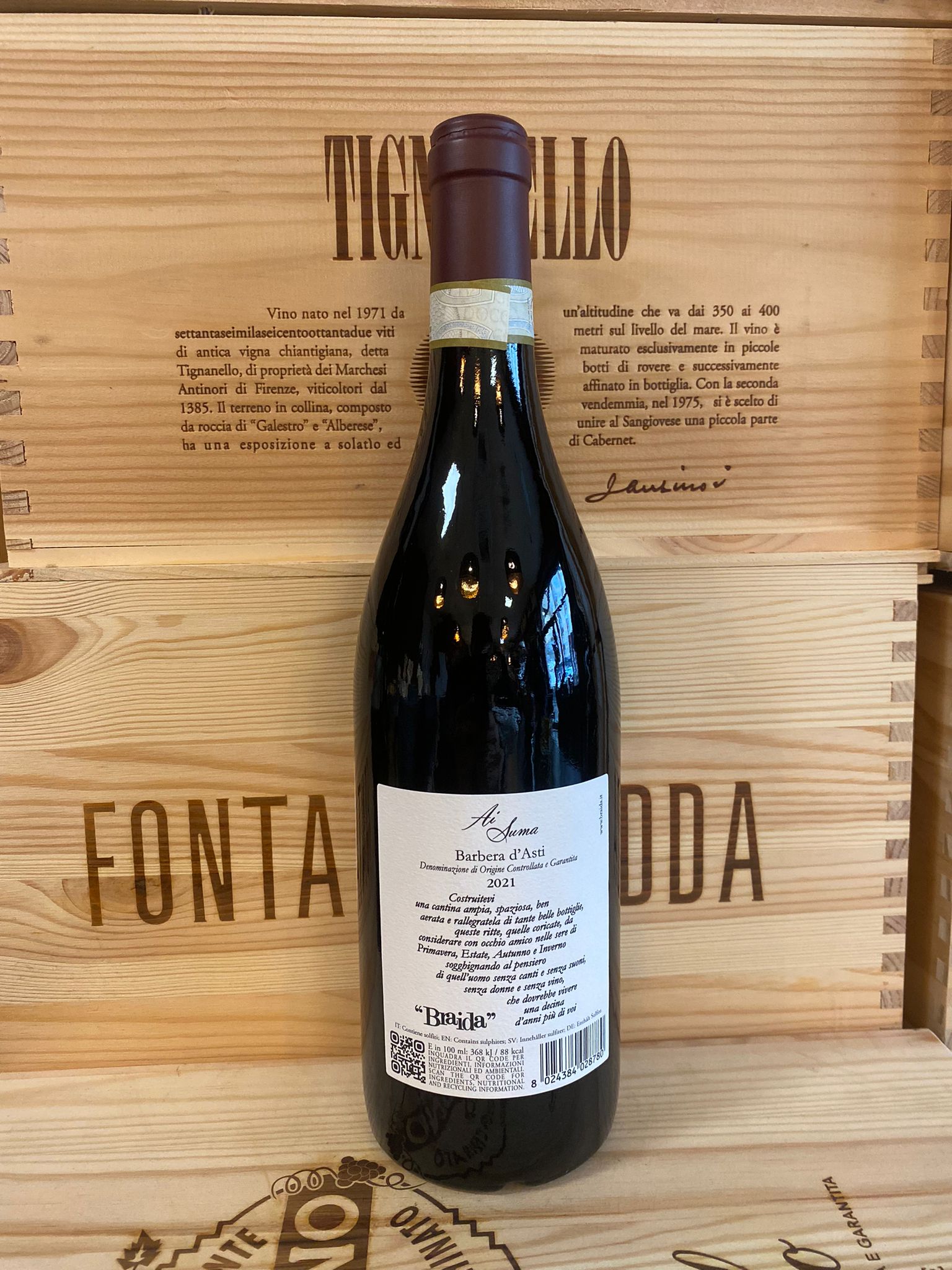 Ai Suma in piemontese significa “Ci siamo” e sembra che Giacomo Bologna, fondatore di Braida, l’abbia pronunciato durante una vendemmia di Barbera. Infatti nel 1989, Giacomo Bologna decise di tardare la raccolta di uve barbera e solo nel momento che ritenne ideale, diede il via ad uno dei vini più apprezzati della sua produzione e non solo.