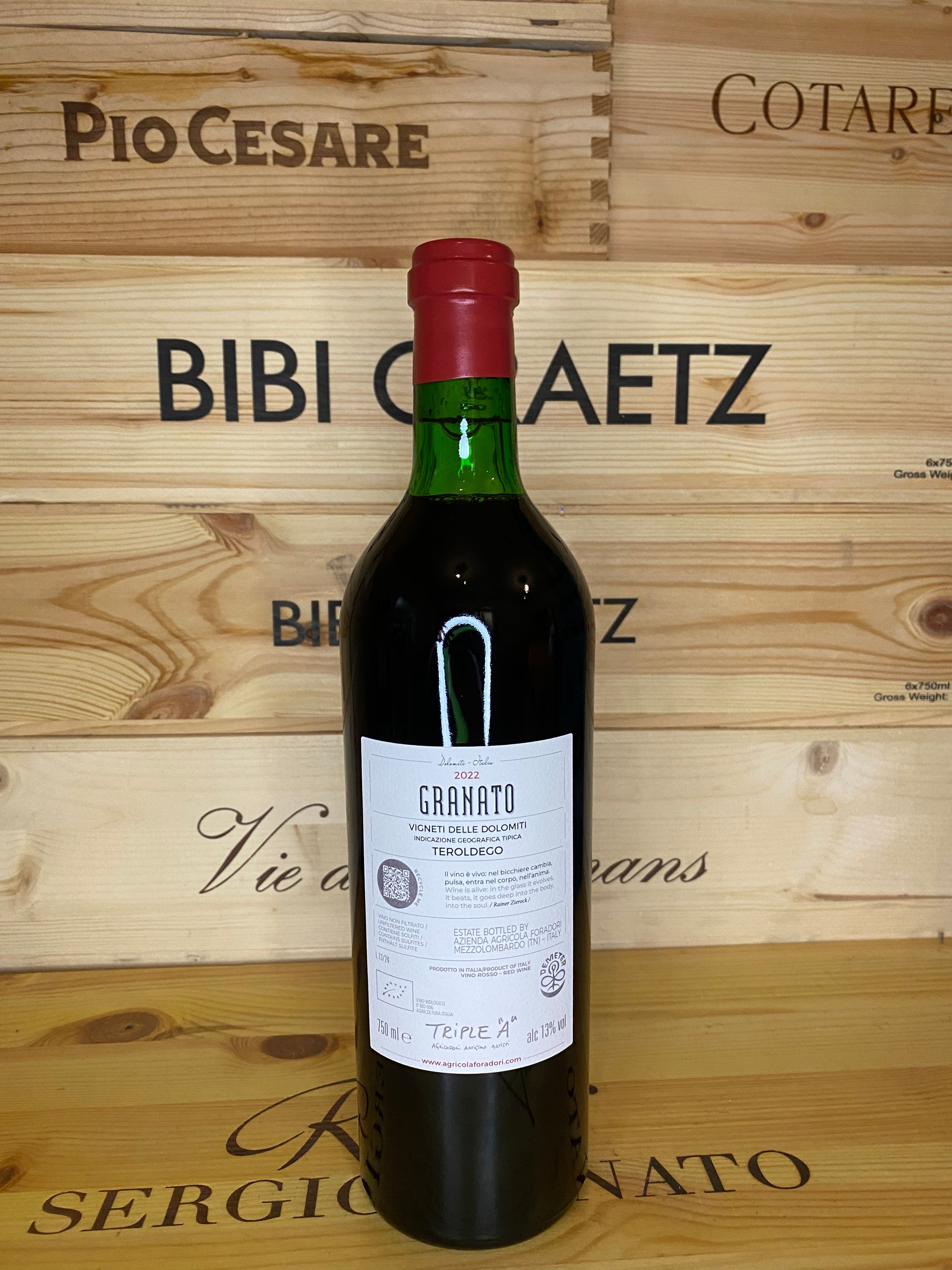 Dalla vinificazione di uve di vitigno Teroldego puro al 100%.. la provenienza è quella classica del Trentino, antiche pergole di proprietà dell’Azienda Agricola Foradori situata a Mezzolombardo, nel cuore del Campo Rotaliano. La vinificazione segue il metodo tradizionale con la fermentazione del mosto proveniente dai raffinati vigneti delle Dolomiti. Rosso IGT "Granato" di Elisabetta Foradori; si sviluppa con lieviti indigeni in grandi tini aperti, mentre l'affinamento è svolto in botti per 15 mesi.